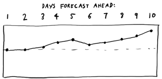 - the next 10-day weather forecast – but with the diminishing accuracy of each future day shown. The accuracy should be computed based on historical data and would no doubt change based on local climate and time of year. An ‘ignore-beyond-here’ line would be good.
